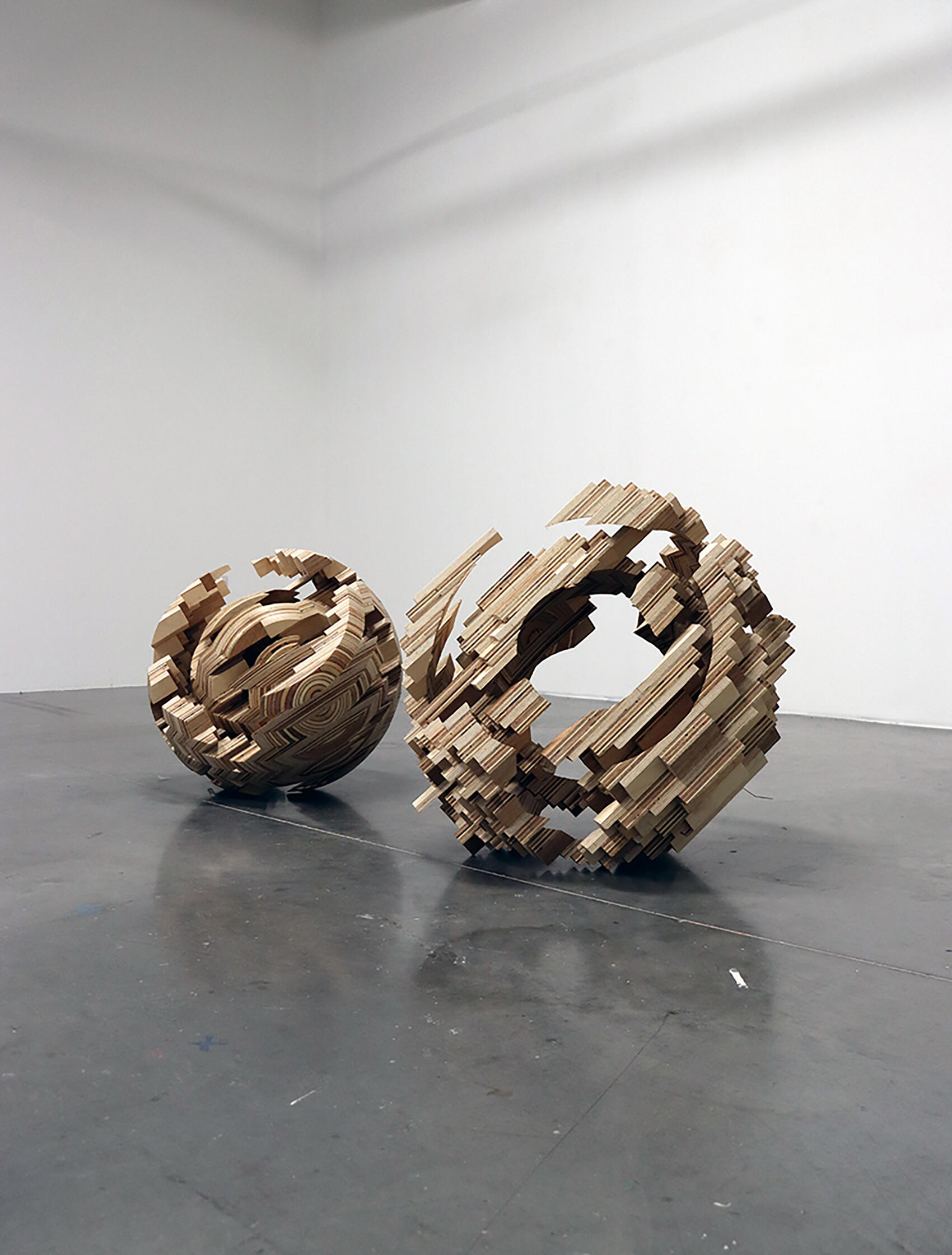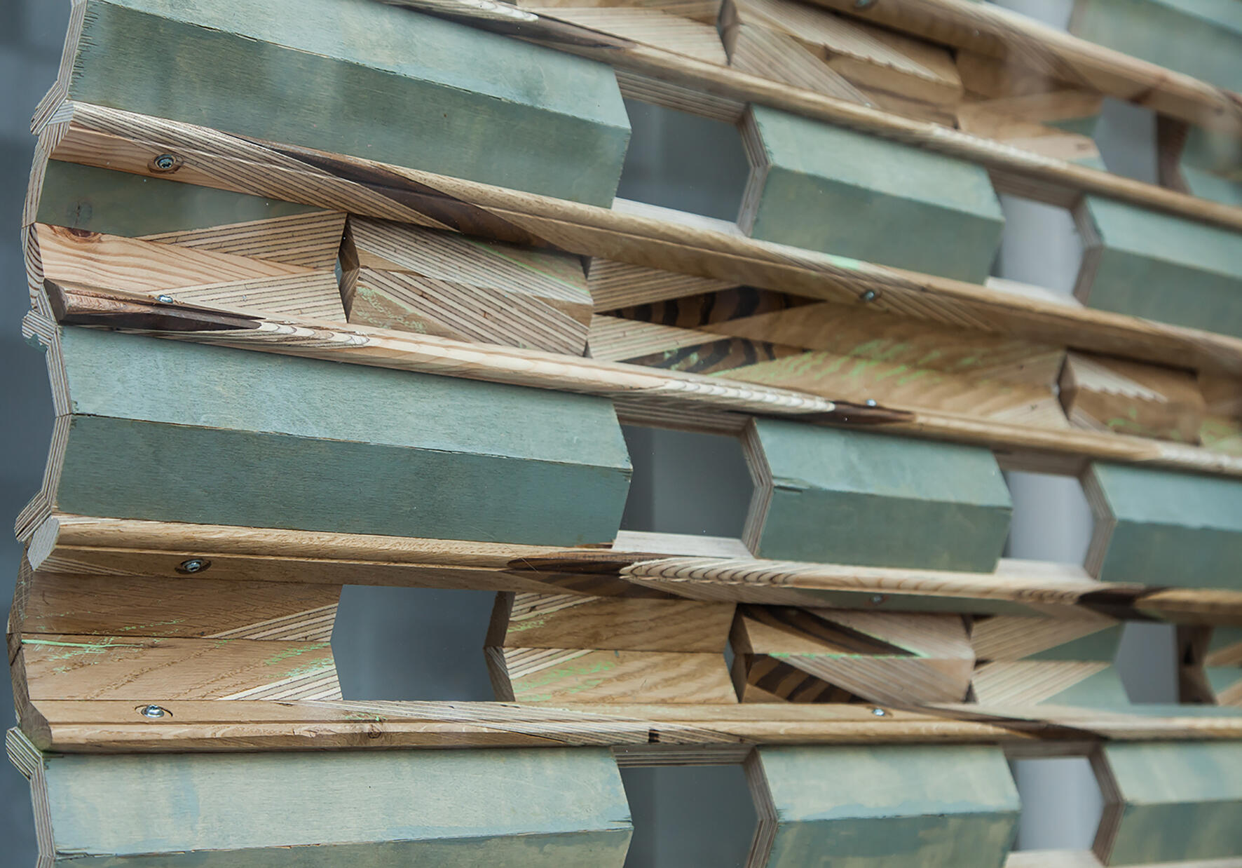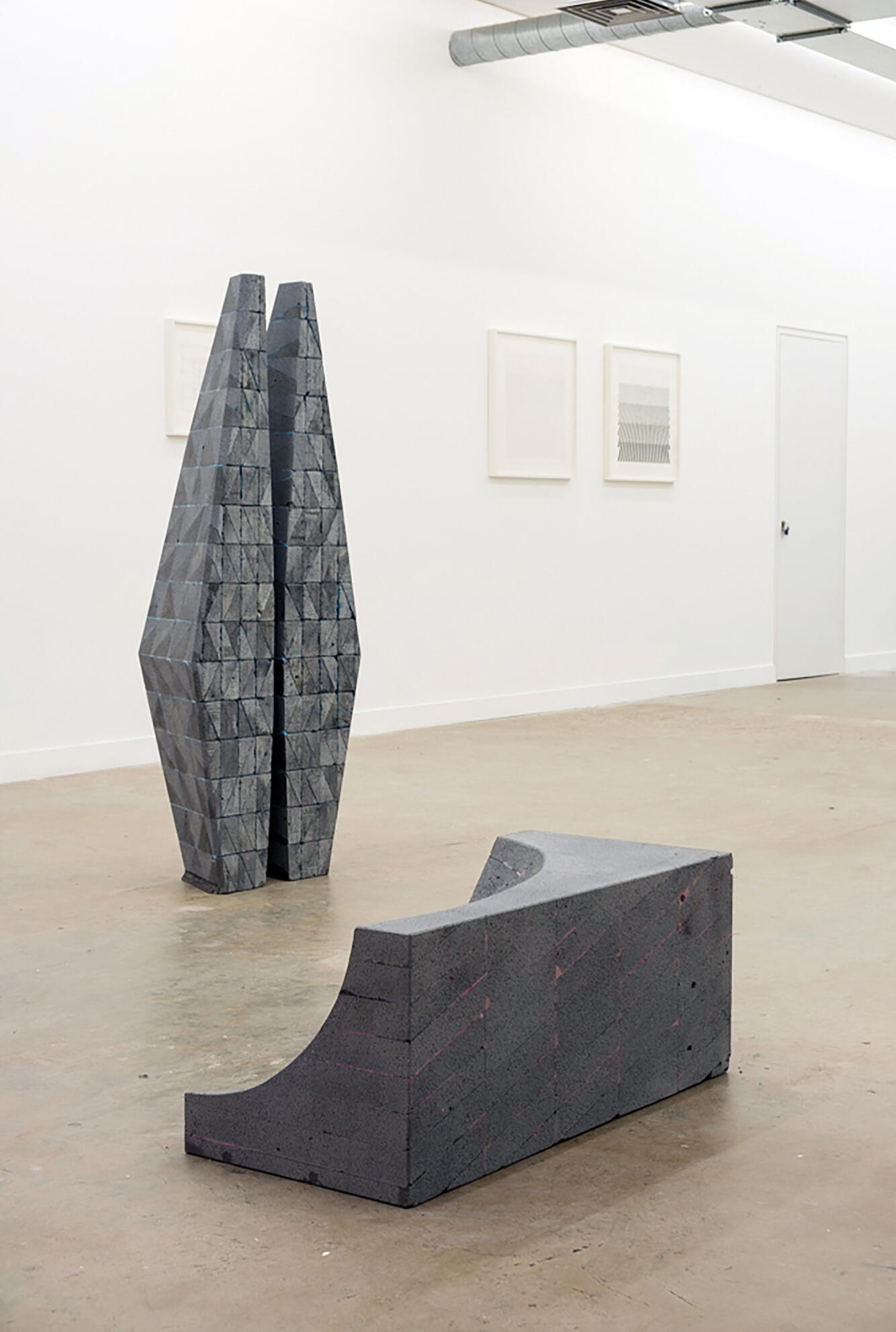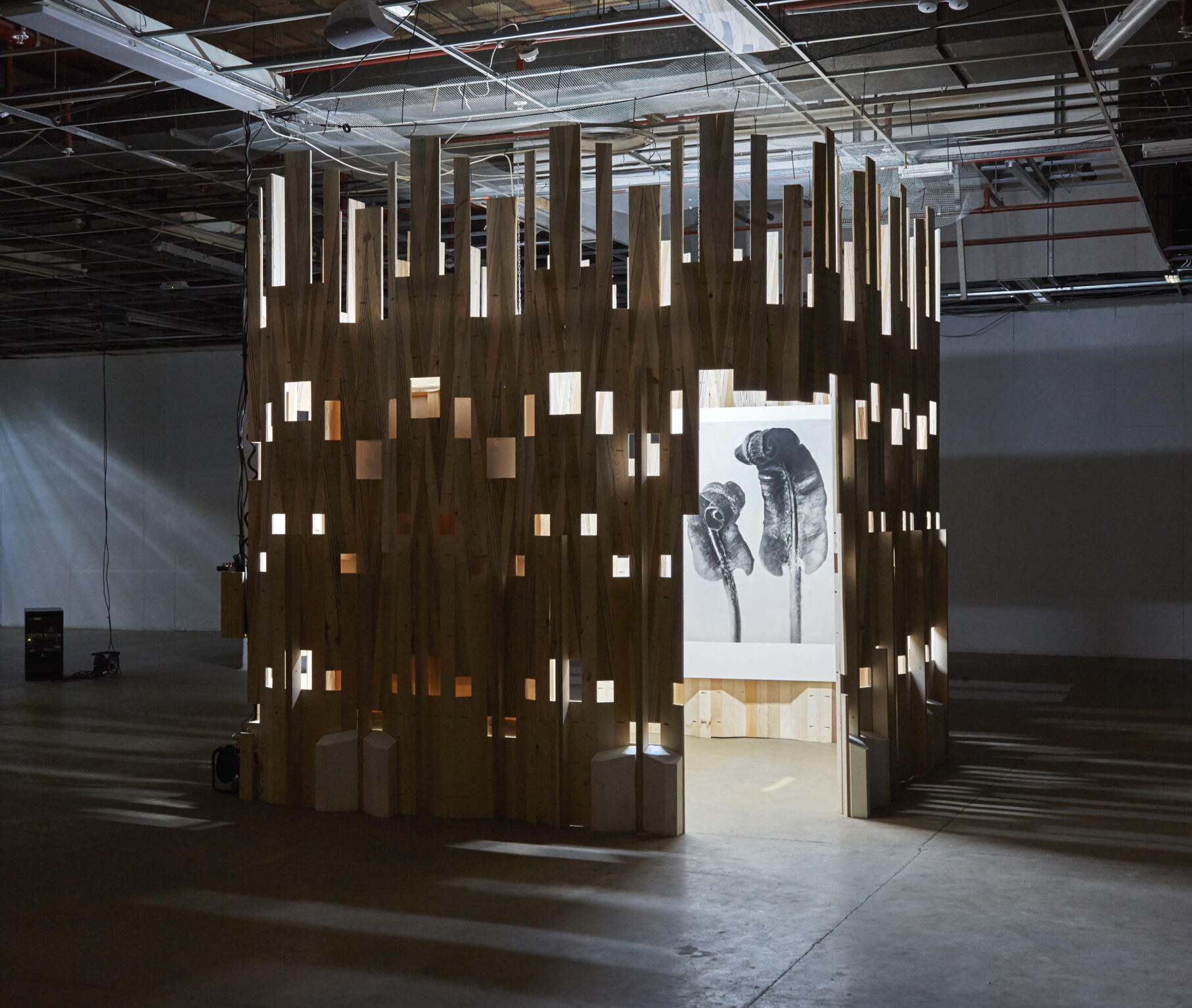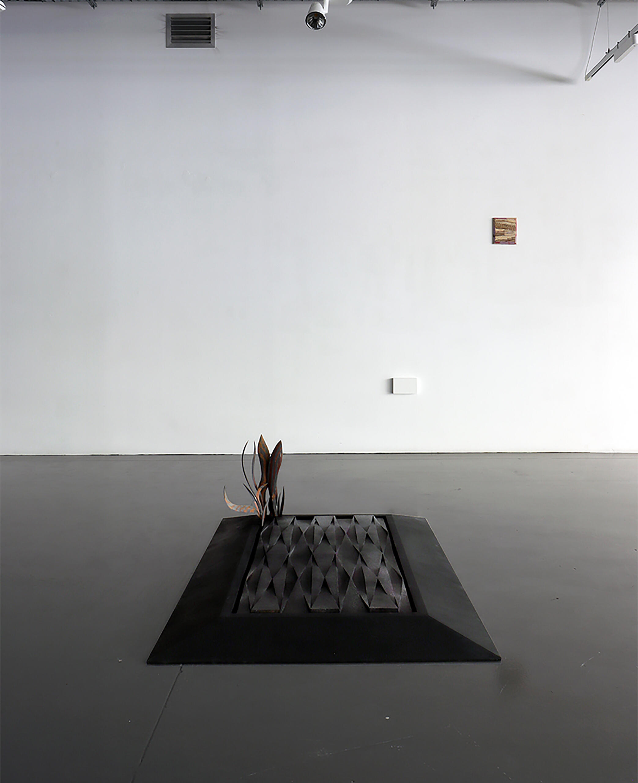 The sensory and interactive presentation in a 6,000ft2 ex-factory hall combines painting, sculpture, sound and site exploring the displacement and speed of attention. ‘No Motion Occurring’ is the second of four exhibitions Shipment will hold at Building F, The Biscuit Factory, Bermondsey and is supported by Shapes Collective, Forma and The University of East London.Two large paintings by Realf Heygate take direct reference from Karl Blossfledt’s 1928 Urformen der Kunst (Art Forms in Nature) photographic publication. These photographs were originally intended for use by design and drawing students to observe paused natural forms that, in a natural habitat, would move and change. With an interest in the motivations to freeze or paralyze natural occurrences, the three artists and two engineers in ‘No Motion Occurring’ present dedicated structures, conditions and images that are made for slowing down or stopping.